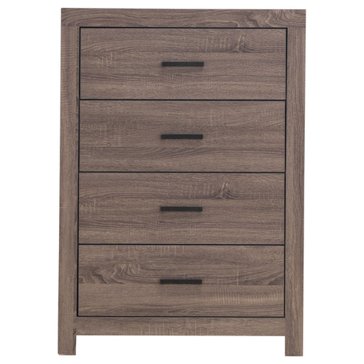 Casually cool style and lots of storage go hand in hand with this chest of drawers. A weathered brown finish over replicated oak grain creates an e...