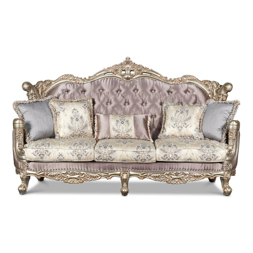 Ophelia Collection by New Classic Furniture Upholstered seat, back, and side Button tufted back Wood carving Scrolled detailing
