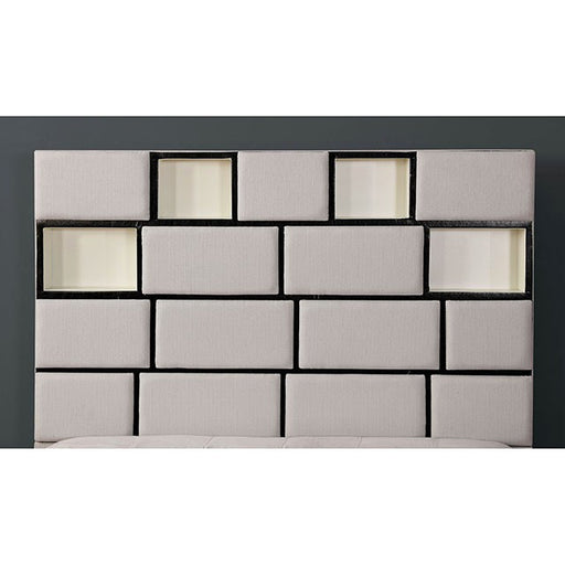 FOA WestGemma Beige/Black Cal.King Bed This is an absolutely dazzling bed. The sectional panels up fabric upholstering make for an unforgettable visual, an...