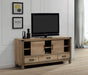 Crown Mark Furniture Matteo 3 Drawer TV Stand in Brown B3200-7. This sleek TV stand has a light finish, clean lines, and black metal bar hardware that matches the accents on the top corners of the frame. With its modern look and sliding doors, this piece is perfect for media storage.