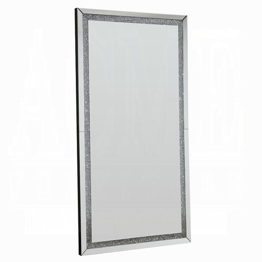 ACME Noralie Grandfather Clock, Mirrored & Faux Diamonds, 18" x 8" x 63"H, 78lbs. Features: - Grandfather Clock - Standing Flat Wall - Storage: 4 Open Compartments - Beveled Mirrored Case-Frame with Faux Diamonds & Clear Glass Inlay - Clock Dial: Roman Numerals - Quartz Mechanism (NO Sound/Chimes) - Battery NOT Included Materials: Glass, Faux Gemstones , LED, Composite Wood