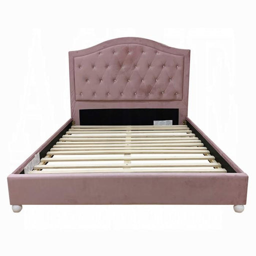 ACME Reggie Twin Bed, Pink Fabric, 81" x 41" x 46"H, 95lbs. The Reggie youth bedroom set in pink fabric is full of character! Every piece in this glamorous collection features crystal-like button tuft details and cute wooden-bun legs in a crisp white finish. The panel bed features an arched headboard with a gentle curve that-s echoed in the dresser mirror. Safety stops are included on all case good drawers, as well as crystal-like pull knobs for an extra sparkle. Let the delightful Reggie collection dress up your home. Features: - Box Spring NOT Required (13 Slats) - Panel Bed: Arched HB, Rectangular FB (Low Profile FB) - Fully Padded Bed & Casegood: Crystal like Button Tufted HB - Material: Fabric, Wooden Frame, Wooden Bun-Round Leg: White Finish - Casegood Drawer: GLIDE) Side Metal, DOVETAIL) English - Materials: Upholstered (Bed), Composite Wood
